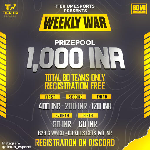 Brace yourselves for intense battles and next level competition! Tier Up Esports is thrilled to present Paid Scrims with a whopping total prize pool of 520 INR and an entry fee of just 20 INR. This marks the highest prize pool distribution in the community, making it an opportunity you wouldn't want to miss.📅 DAILY PAID SCRIMS ONLY 20RS ENTRY PER TEAM🏆 Highest Prize Pool Distribution in the Community