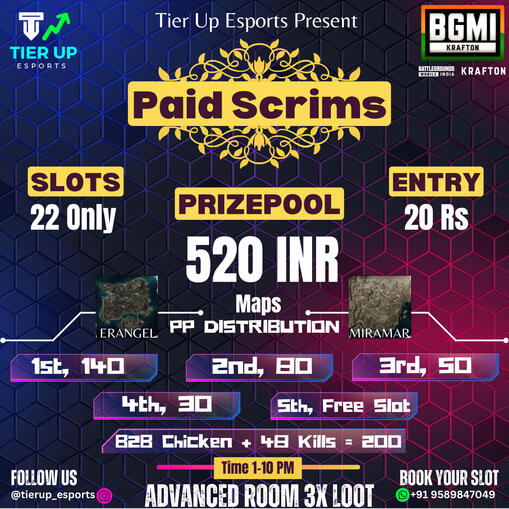 Brace yourselves for intense battles and next level competition! Tier Up Esports is thrilled to present Paid Scrims with a whopping total prize pool of 520 INR and an entry fee of just 20 INR. This marks the highest prize pool distribution in the community, making it an opportunity you wouldn't want to miss.📅 DAILY PAID SCRIMS ONLY 20RS ENTRY PER TEAM🏆 Highest Prize Pool Distribution in the Community